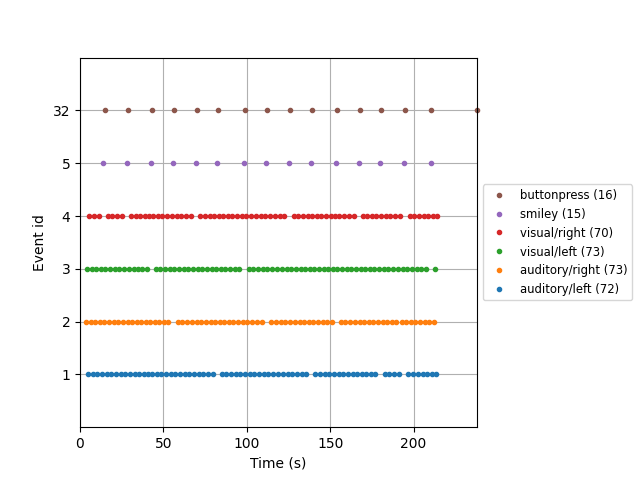 이와 같은 이벤트 사전은 연속 데이터에서 에포크를 추출할 때 사용된다. 사전 키의 / 문자는 부분 조건 설명자를 요청하여 조건 전체에 풀링을 허용한다 (즉, 요청 'auditory'하면 이벤트 ID 1 및 2 'left'가 있는 모든 에포크가 선택되고, 요청하면 이벤트 ID 1 및 3이 있는 모든 에포크가 선택됨). plot_events 녹화 기간 동안 이벤트 분포를 시각화 하는 편리한 기능도 있다 (이벤트 감지가 예상대로 작동하는지 확인하기 위해). 여기서 Info 속성을 사용하여 녹음의 샘플링 빈도를 얻을 수 있다 (따라서 x축은 샘플 대신 초 단위가 된다).