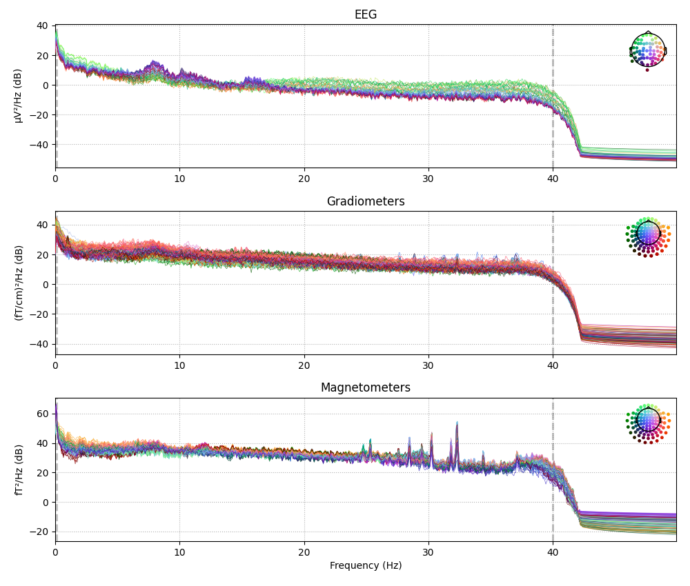 Raw 객체에는 몇 가지 내장된 플로팅 방법이 있다. 여기에서는 raw의 각 센서 유형에 대한 전력 스펙트럼 밀도 (PSD)와 plot_psd로 원시 센서 트레이스의 플롯을 보여준다. PSD 플롯에서는 50Hz 미만의 주파수만 표시한다 (데이터가 40Hz에서 저역 통과 필터링되기 때문에). 대화형 Python 세션에서 plot 대화형이며 스크롤, 크기 조정, 잘못된 채널 표시, 주석, 프로젝터 토글 등을 허용한다.