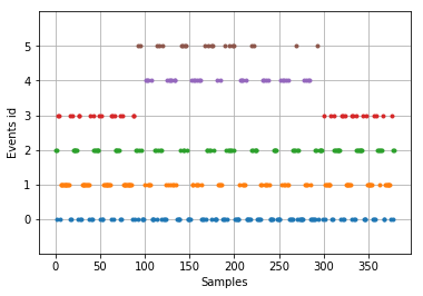 epochs 객체의 이벤트 매개변수는 (n_epochs,3)과 같은 차원을 갖는 numpy ndarray이다. 각 epoch에 대해 다음과 같은 구조를 갖는다. (event_sample, previous_event_id, event_id)