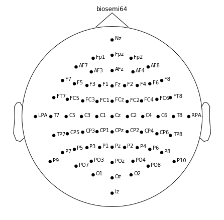채널의 위치를 가져온다. 데이터는 64개 채널이 있는 바이오세미 eeg 장치로 수집된다. 따라서 채널 위치를 얻으려면 biosemi64를 read_montage 함수에 전달해야 한다.