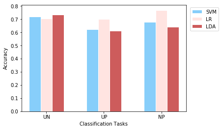 accuracies.append([acc_svm, acc_lr, acc_lda])