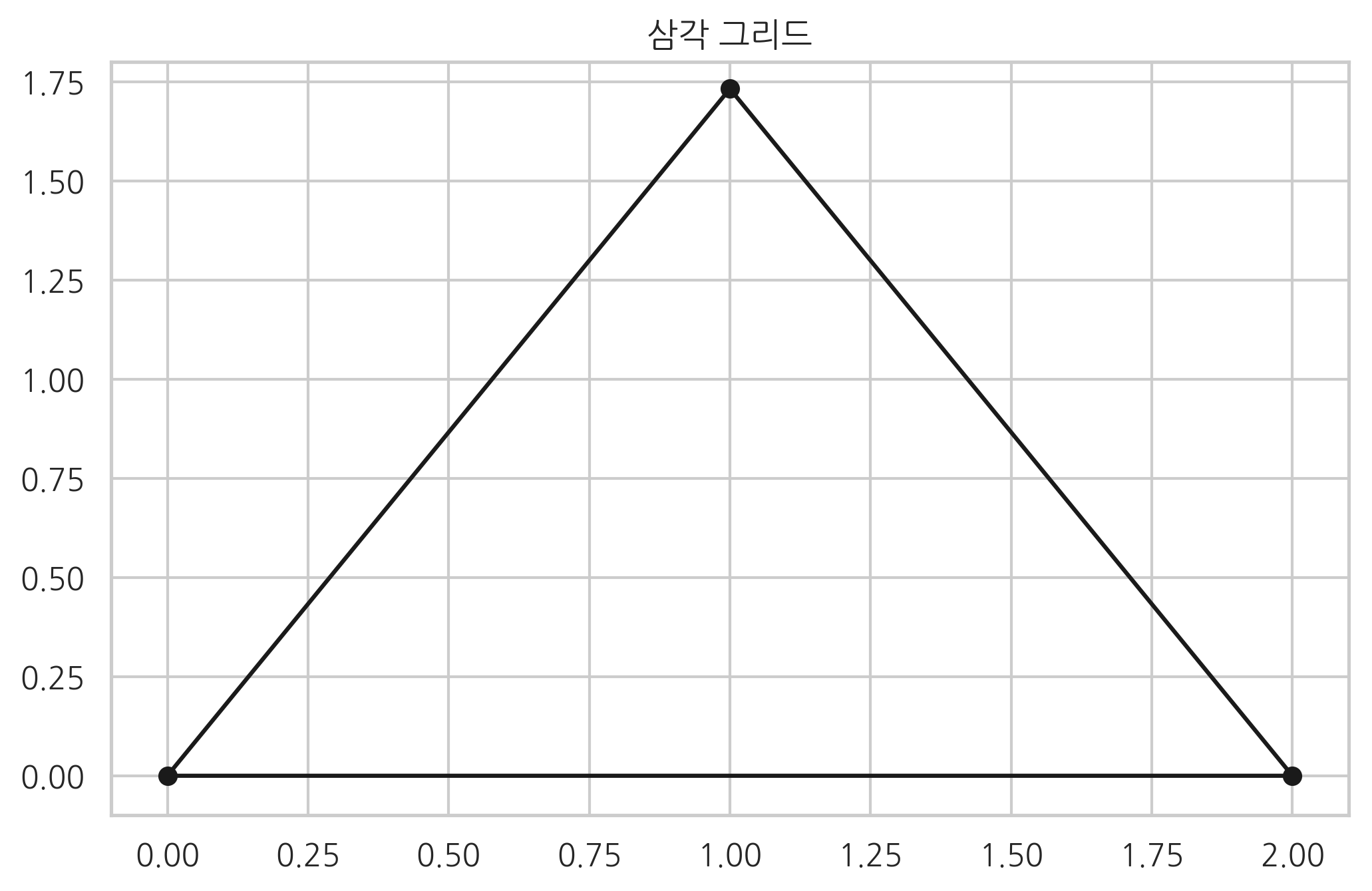 삼각 그리드는 Triangulation 클래스로 생성한다. Triangulation 클래스는 x. y, triangles 세 개의 인수를 받는데 x, y는 일련의 점들의 x좌표와 y좌표를 나타내는 1차원 벡터들이고 triangles는 이 점들에 대한 기하학적 위상 정보 즉, 어떤 삼각형이 있으며 각 삼각형이 어떤 점들로 이루어져있는가를 보인다. 만약 triangles가 주어지지 않으면 자동으로 생성한다.