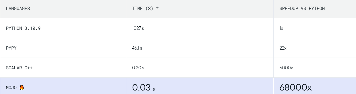 Mojo combines the usability of Python with the performance of C, unlocking unparalleled programmability of AI hardware and extensibility of AI models.