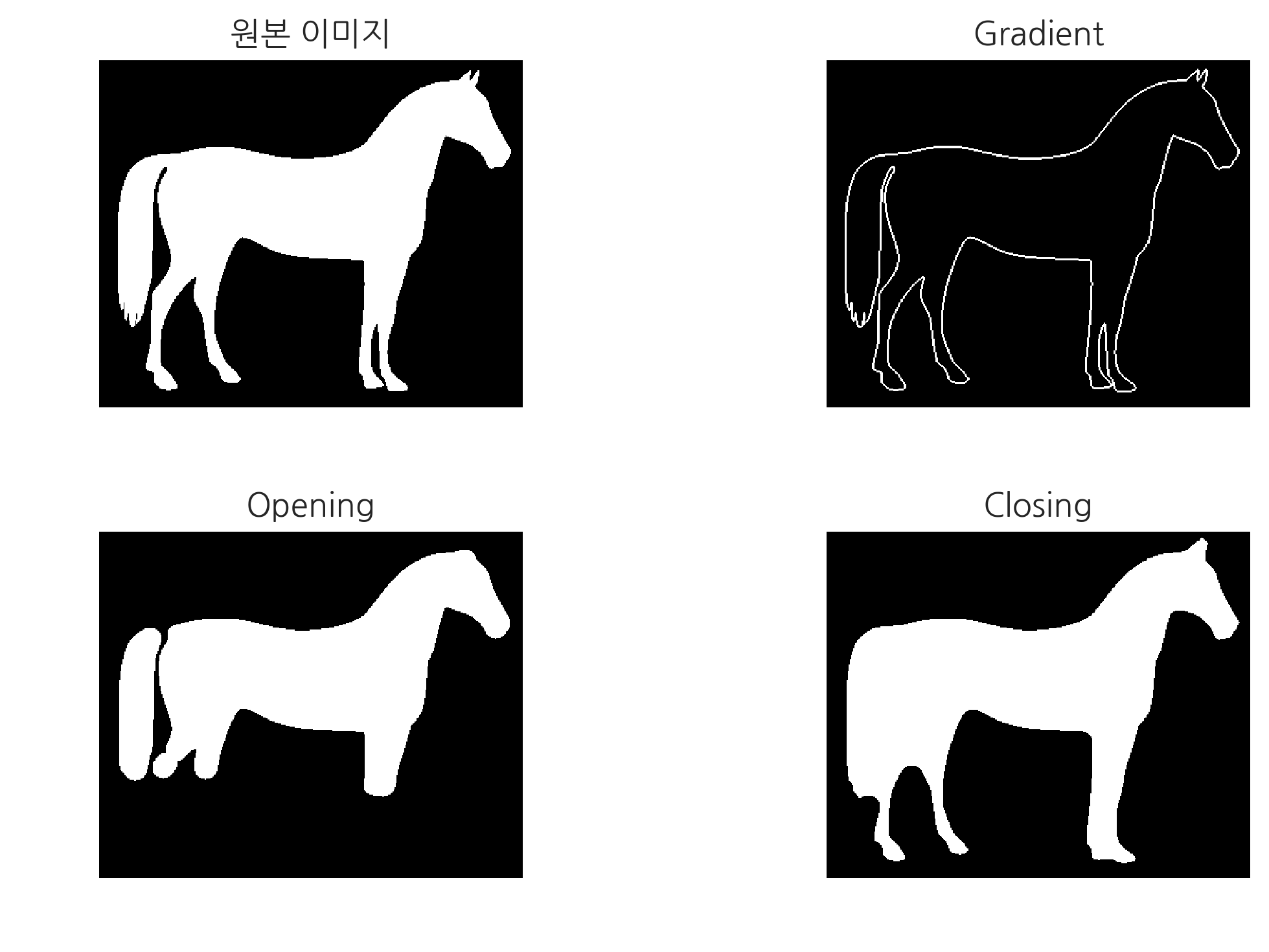 titles = ["원본 이미지", 'Gradient', 'Opening', 'Closing']