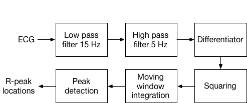 Pan-Thompkins 알고리즘은 널리 사용되며 실시간 연속 QRS 검출에 사용될 수 있다. 알고리즘은 일련의 필터를 사용하여 심전도의 기울기, 너비 및 진폭 분석을 기반으로 한다. 심전도 신호는 먼저 대역 통과 필터를 통과한 다음 미분기, 제곱 연산, moving window 적분기를 통과하고 마지막으로 적응형 임계값 및 search-back을 통해 R-피크를 찾는다.