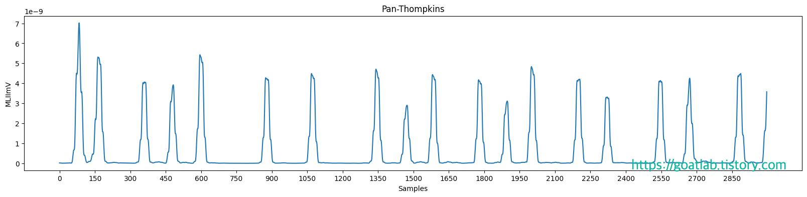 그런 다음 필터링된 ECG를 미분하고 제곱하여 QRS 복합을 증폭한다. 유도 필터는 P파와 T파의 저주파 성분을 추가로 억제한다. 제곱은 신호를 양수로 만들고 고주파 QRS complex을 증폭하여 도함수를 향상시킨다.