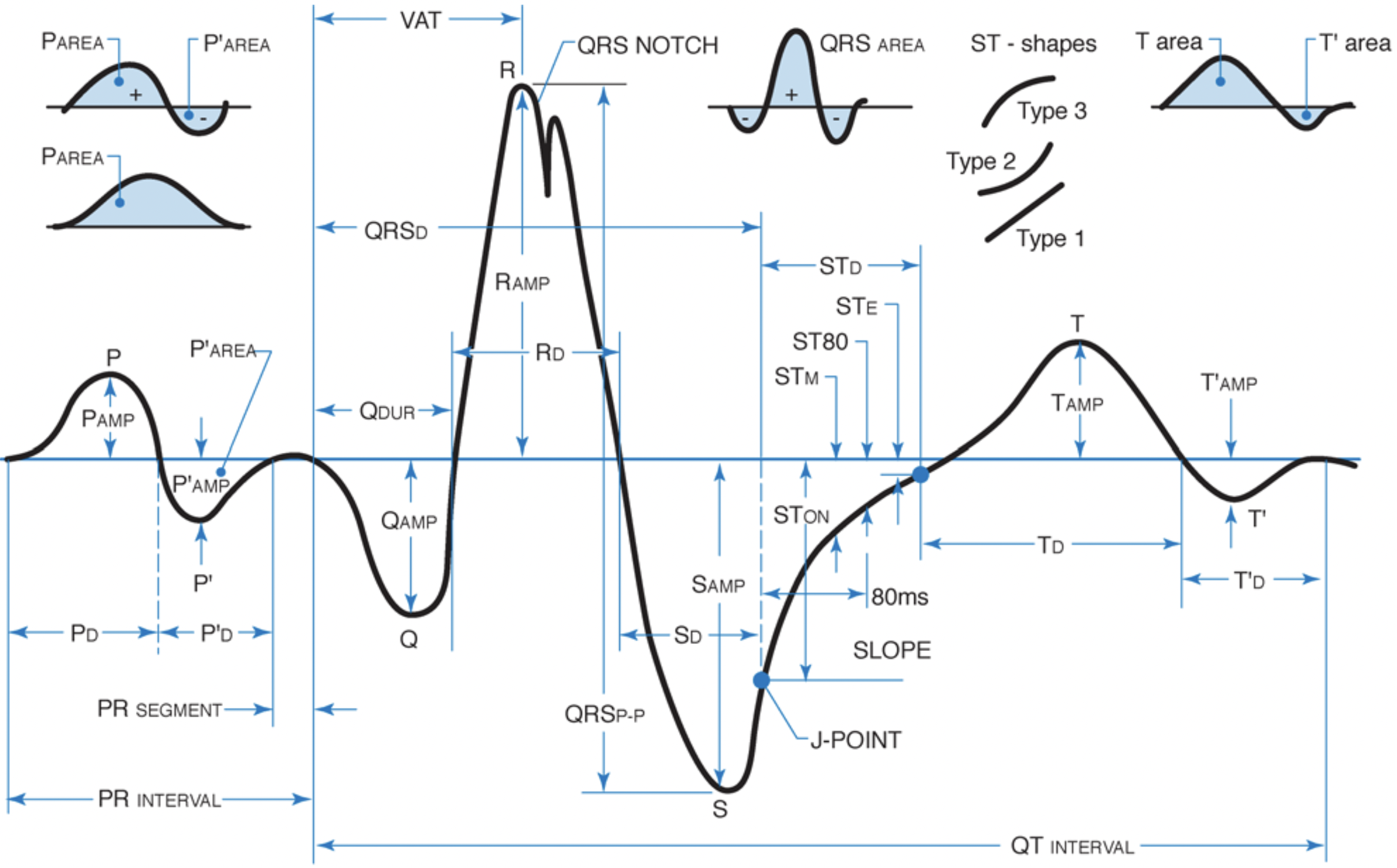 ST 상승과 우울증은 모두 급성 심근 허혈 또는 ST-고혈압 심근경색 (STEMI)과 같은 심장 기능 장애와 관련이 있기 때문에 ST 세그먼트는 ECG 파형의 또 다른 중요한 형태학적 특징이다. 상승 또는 우울증은 J 지점 (ST 세그먼트가 시작되는 곳)과 PR 세그먼트 사이의 차이 (밀리미터)로 계산된다. 마지막으로, T파는 수축 세포의 재편극을 반영하며 또한 범위 o 심장 상태와 관련이 있다.