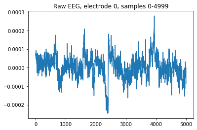 plt.title("Raw EEG, electrode 0, samples 0-4999")