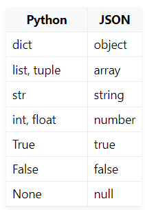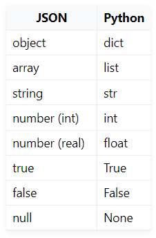 JSON은 다른 데이터 유형을 사용하고 모든 Python 데이터 유형에 대해 일치하는 항목이 없다.