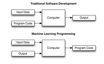 | • 기존 소프트웨어 개발 : 프로그래머는 입력을 원하는 출력으로 변환하는 방법을 지정하는 프로그램을 만든다. • 기계 학습 :프로그래머는 주어진 입력에 대해 원하는 출력을 생성하는 방법을 배울 수 있는 모델을 만든다. 이 학습은 컴퓨터 프로그램의 전통적인 역할을 채운다. |