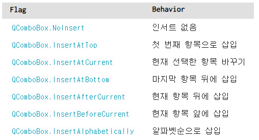 삽입을 처리하는 방법을 결정하기 위해 플래그를 설정할 수도 있다. 이러한 플래그는 QComboBox 클래스 자체에 저장되며 아래에 나열된다.