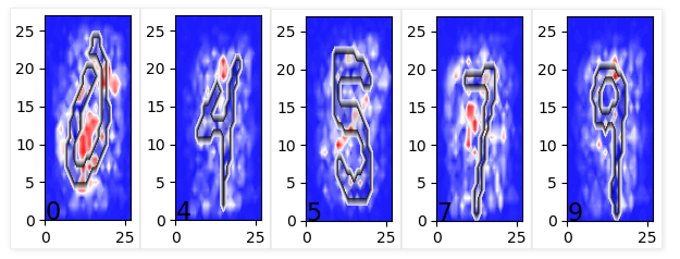 이 heat map은 분류된 숫자에 대해 가장 높은 감도 점수를 가진 픽셀을 보여준다. 가운데 빈 공간이 0을 분류하는 데 얼마나 중요한지 알 수 있다. 4개와 9개는 왼쪽 상단 모서리에 약간의 정보가 없으면 서로 혼동하기 쉽다. 왼쪽 상단 루프를 완성하면 7을 9로 혼동할 수 있고 약간의 대각선을 그리면 5를 6 또는 8과 혼동할 수 있다.