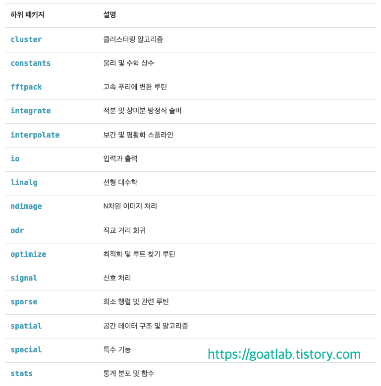 SciPy는 다양한 과학 컴퓨팅 도메인을 포괄하는 하위 패키지로 구성된다.