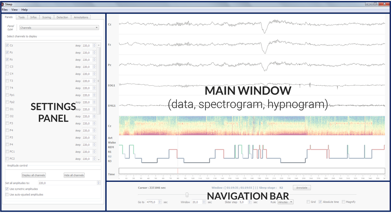 설정 패널은 소프트웨어의 대부분의 (고급) 기능이 있다. 무엇보다도 표시할 채널을 제어하고, 진폭을 조정하고, 스펙트로그램과 수면곡선을 사용자 지정하고, 각 수면 단계의 지속 시간을 계산하고, 기록에 주석을 추가하고, 반자동 감지 (스핀들, K- 콤플렉스…)한다. 각 탭에 대한 설명은 Settings panel tabs 섹션을 참조하면 된다.