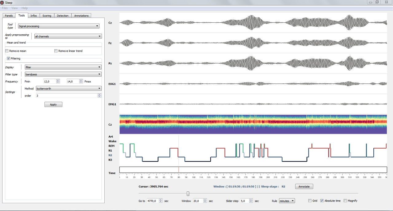 수면 방추, K-복합체, 빠른 안구 움직임과 같은 위상 이벤트의 반자동 감지를 수행한다. 자세한 내용은 반자동 감지 적용을 참조하면 된다.