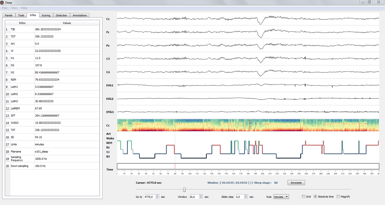 Infos 패널은 녹음 정보 (ex: 이름 및 다운샘플링 주파수)와 수면곡선 기록으로 계산된 주요 수면 통계를 표시한다 (아래 사양 참조). 이 값은 최면술을 편집할 때 실시간으로 조정된다. 수면 통계는 .csv 또는 .txt 파일로 내보낼 수 있다.
