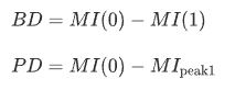 여기서 MI peak1은 2에서 7까지의 k 범위에서 MI(k) 의 첫 번째 극한 최대값을 나타내며 HR에 대한 호흡의 변조를 나타낸다. 해당 범위 내에서 피크가 사라지면 최대값이 사용된다. BD 와 PD 모두 시간 지연에 따라 정보 흐름을 정량화하여 RR 시퀀스의 복잡성을 반영할 수 있다.