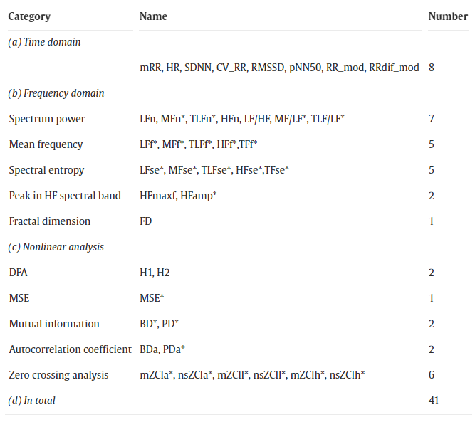 시간 도메인 및 주파수 도메인 기능에 의해 무시되는 일부 정보를 제공하기 때문에 많은 고급 비선형 방법이 HRV 분석에 적용되었다. 그러나 안정적인 결과를 얻기 위해서는 장기간의 데이터 시리즈가 필요한 경우가 많다. 본 연구에서는 단기 HRV 분석에 적합한 일부 비선형 접근법만 사용하였다. 이러한 방법에는 detrended 변동 분석, 멀티스케일 엔트로피, 상호 정보, 자기 상관 계수 및 제로 크로싱 분석이 포함된다.