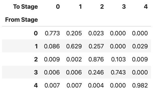 probs는 확률 전이 행렬이다. 즉, 현재 수면 단계가 A인 경우 다음 수면 단계가 B일 확률은 얼마일까?