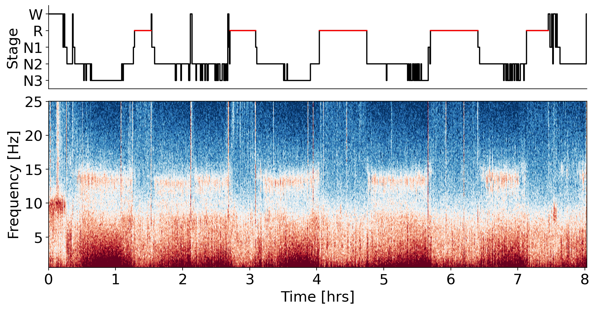 이제 수면곡선과 데이터의 모양이 같으므로 밤새 단일 EEG 채널의 시간-주파수 표현을 보여주는 기능을 사용하여 멀티테이퍼 스펙트로그램 위에 수면곡선을 그릴 수 있다. yasa.plot_spectrogram() 스펙트로그램의 x축은 시간 (시간)이고 y축은 주파수 범위 (0~25Hz)이다. 더 따뜻한 색상은 이 채널에 대해 이 특정 시간에 이 특정 주파수 대역에서 더 높은 스펙트럼 전력을 나타냅니다. 이러한 종류의 플롯은 NREM 수면 (5Hz 미만의 주파수에서 높은 전력 및 약 ~14Hz의 스핀들 관련 활동) 및 REM 수면 (5Hz 미만의 주파수에서 전력이 거의 없음) 기간을 신속하게 식별하는 데 매우 유용하다.