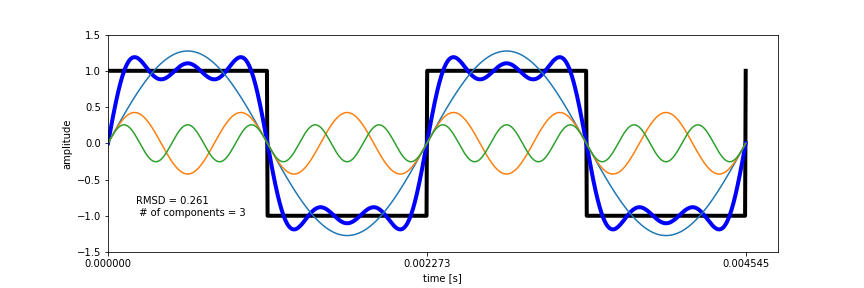 구성 요소의 수가 증가할수록 시리즈는 원본에 점점 더 가까워진다. 평균 제곱근 편차 (맞춤 품질 의 지표, 낮을수록 좋음)는 로그 방식으로 감소한다.