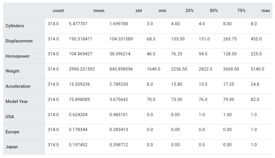 (의도적으로 훈련 세트만 사용하여 통계치를 생성했다. 이 통계는 테스트 세트를 정규화할 때에도 사용된다. 이는 테스트 세트를 모델이 훈련에 사용했던 것과 동일한 분포로 투영하기 위해서이다.)