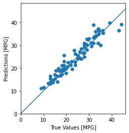 마지막으로 테스트 세트에 있는 샘플을 사용해 MPG 값을 예측한다.