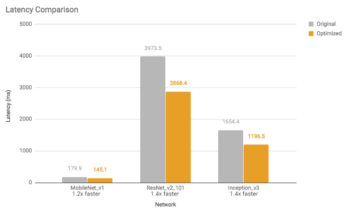 TFLite가 사용하는 가장 유용한 최적화 중 하나는 양자화이다. 양자화는 주어진 실수 값에 대해 상위 비트보다 하위 비트 표현을 사용한다. 예를 들어, 32비트 (또는 4바이트) 부동 소수점 숫자와 같은 연속 실수를 8비트 (또는 1바이트) 정수와 같은 이산 숫자로 나타낼 수 있다. 딥러닝에서 가중치와 편향 (또는 단순히 신경망의 매개변수)은 32비트 부동 소수점 숫자로 저장되므로 모델 교육 중에 고정밀 계산이 발생할 수 있다. 그리고 모델이 훈련될 때 8비트 정수로 축소될 수 있으며 이는 결국 모델 크기의 축소를 의미한다. 16비트 부동 소수점 (크기 2배 감소) 또는 8비트 정수 (크기 4배 감소)로 줄일 수 있다. 물론, 이것은 모델 예측의 정확성에 대한 절충과 함께 올 수 있다. 그러나, 그것은 양자화된 모델은 특히 16비트 부동 소수점을 사용하여 모델의 크기를 절반으로 줄이는 경우 상당한 감쇠를 겪지 않거나 전혀 감쇠하지 않음을 많은 상황에서 경험적으로 보여준다. 마찬가지로 활성화 값을 양자화할 수도 있지만 대표적인 데이터 세트에서 일부 스케일링 매개변수를 결정하려면 보정 단계가 필요하다. 이것은 "전체 양자화" 하위 섹션에 자세히 설명되어 있다. 그림은 각각 모델 크기, 대기 시간 및 정확도에 대한 전체 양자화 (8비트 INT에 대한 가중치 및 활성화 값)의 영향과 관련된 몇 가지 예를 보여준다. 그들은 실험을 위해 Google Android Pixel 2를 사용했다.
