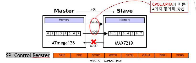 MAX7219의 통신은 LOAD 데이터를 Low로 주면 시작된다. 이것은 SPI 통신에서 /SS를 Low 신호를 주는 슬레이브와 통신한다는 것이다. 그 다음, 클럭 (SCLK)과 데이터선 (MOSI/MISO)의 동기화 방법에서 GPIO 방법을 사용하면 있는 그대로 타이밍도를 표현하면 되는데 SPI 통신을 사용할 경우에는 SPI 레지스터를 설정하여 타이밍도에 맞는 동기화 방법을 정확히 설정 해줘야지만 동작한다.