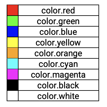 color parameter를 사용하여 상자에 색상을 지정한다. color=color.<colorName>, colorName은 위 테이블 색상 중 하나이다. box(pos=vector(1, 2, 3), size=vector(4, 5, 6), color=color.red)는 (1, 2, 3)에 배치하고 크기(4, 5, 6)에 빨간색 상자를 만든다.