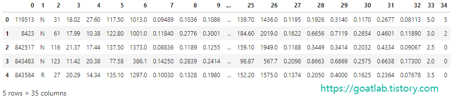 특징은 유방 종괴의 미세 바늘 흡인물 (FNA)의 디지털화된 이미지에서 계산된다. 이것은 이미지에 존재하는 세포 핵의 특성을 설명한다. (https://archive.ics.uci.edu/ml/datasets/Breast+Cancer+Wisconsin+%28Diagnostic%29)