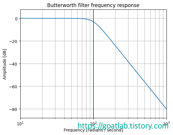 버터워스 필터는 시간 도메인에서 측정한 결과에 적용되는 필터이고 원하지 않는 주파수 영역의 값을 필터 처리할 때 사용한다. SciPy에는 다음과 같이 N차 디지털 또는 아날로그 버터워스 필터를 설계하고 필터 계수를 반환하는 함수가 존재한다.