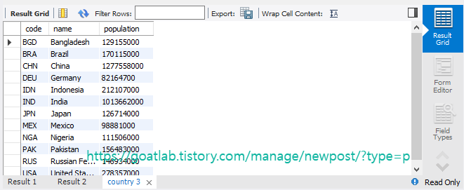 # 컬럼 : 국가코드, 국가이름, 인구수